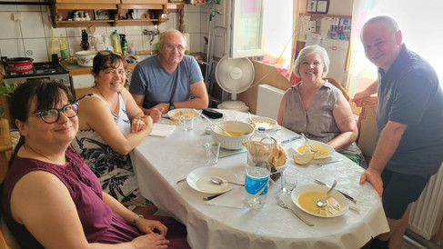 The next stop was lunch with Judith and Barna Kovacs (they are with CEF serving in Romania and other areas). Judith had prepared an amazing lunch. Menu: first course: green beans in cream; second: roasted potatoes, cabbage rolls, boneless chicken wrapped in bacon, a BBQ beef stew, chicken livers in gravy, pickled cucumbers, and sautéed vegetables with sauce; dessert: 3 delicious cakes squares, chocolate and vanilla ice cream with a mountain berry sauce. We were stuffed! We sat outside and talked for a long time about everything.